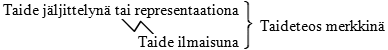Nyt voidaankin kysyä, kulkeeko semioottinen taidekäsitys ilmaisuteorian vanavedessä myös tässä suhteessa. Mihin semioottinen taidekäsitys tähtää luonnehtiessaan taideteosta merkiksi (tai symboliksi, tekstiksi, kieleksi)? Tähän kysymykseen yritän vastata myöhemmin.